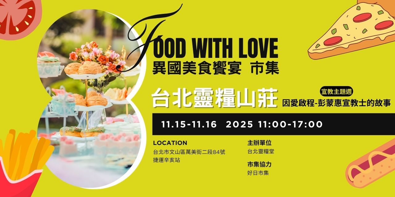 「因愛啟程-彭蒙惠宣教士的故事」將在11月的靈糧山莊舉辦,同時間將有異國美食市集,來豐富大家的味蕾以及對異國文化的體驗。四場宣教活動預計吸引4000人次前往,本市集免費參與,歡迎異國美食、文創手作共同參與。